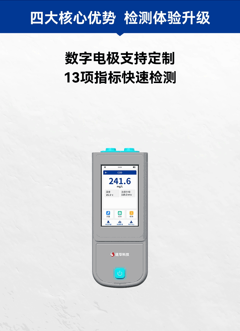1、手持式迷你主機,支持COD、氨氮、濁度、藍綠藻、葉綠素、電導率、PH、ORP、溶解氧、污泥濃度、溫度13項指標快速檢測,滿足各領域水質檢測需求;