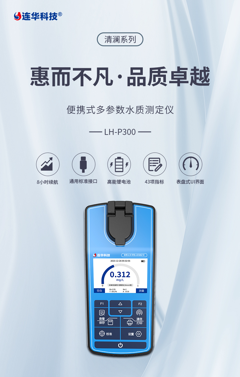 簡要描述: 清瀾系列LH-P300是一款手持式多參數水質測定儀,能夠快速、準確地測量水樣中的COD、氨氮、總磷、總氮、有機污染物及無機污染物等多項參數,儀器小巧輕便,操作簡單功能齊全,具有極高的性價比。經典連華家族式動態表盤界面,量程超限紅色警示,內置大容量鋰電池,采用Type-c標準接口,續航持久,充電、數據傳輸都非常方便。