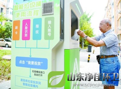 建國門街道外交部街33號院居民正在使用新安裝的智能垃圾桶。小區(qū)內新設的6臺單體智能垃圾桶,可以進行人臉、指紋識別,還可以刷積分卡,方便居民更好地分類投放廚余垃圾,同時還能及時記錄每個用戶參與分類的頻次和數量。本報記者 和冠欣攝